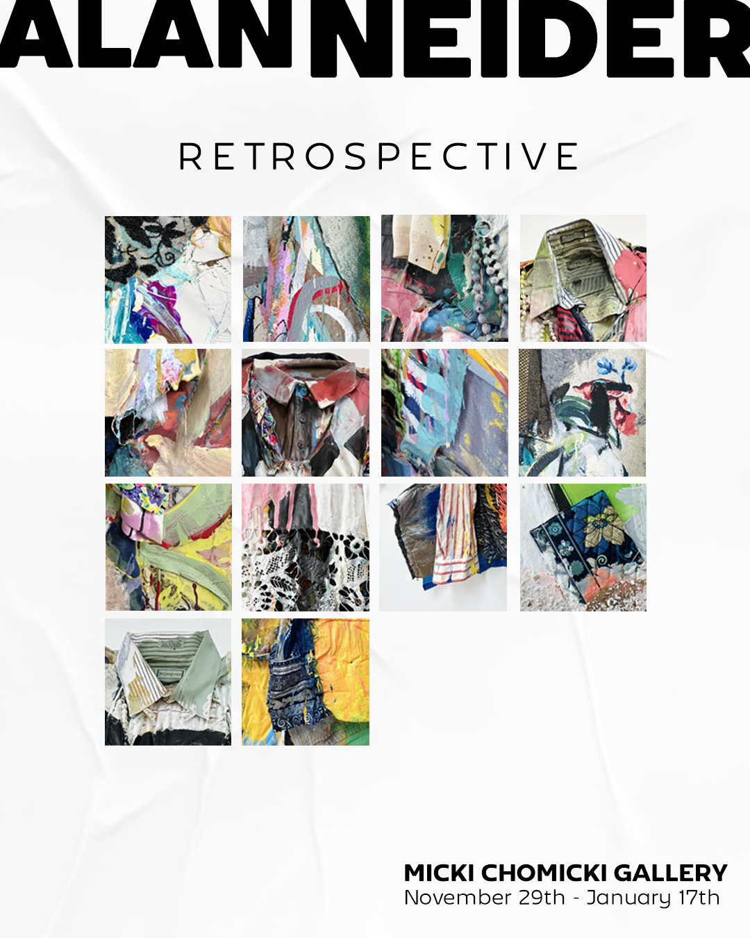 In Alan Neider :: retrospective, we see painting that refuses to behave. The materials do not do what one expects of them; colors slip out of their roles, textures and fabrics live with a borderline personality disorder, and the assumed forms have decided not to obey Newton’s law of gravity. Everything that is usually taken for granted in painting — composition, balance, and logic — shifts. It forms the core of Neider’s powerful poetics.